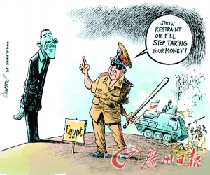 埃及军方拿着棒子说:“要么克制,要么我就不要你给钱了!”美国总统奥巴马则好像被石化。画面背景是埃及军方镇压民众。