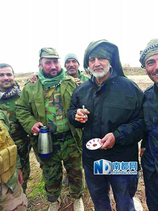 伊朗将军卡西姆·苏雷曼尼(便装)在伊拉克提克里特前线拍摄的照片。