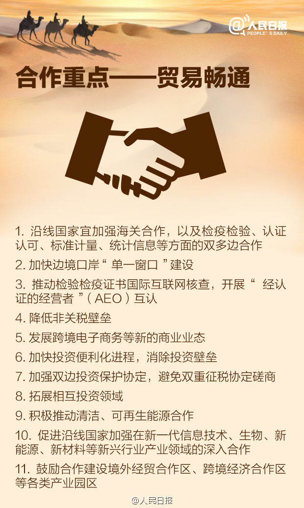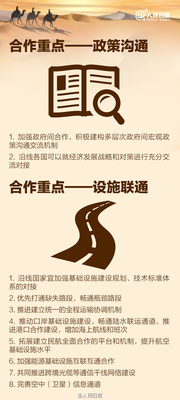 沿线各国资源禀赋各异,经济互补性较强,彼此合作潜力和空间很大。以政策沟通、设施联通、贸易畅通、资金融通、民心相通为主要内容,重点在以下方面加强合作。