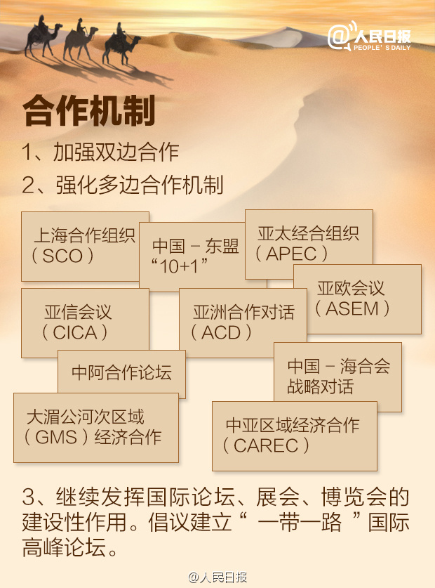 强化多边合作机制作用,发挥上海合作组织(SCO)、中国-东盟“10+1”、亚太经合组织(APEC)、亚欧会议(ASEM)、亚洲合作对话(ACD)、亚信会议(CICA)、中阿合作论坛、中国-海合会战略对话、大湄公河次区域(GMS)经济合作、中亚区域经济合作(CAREC)等现有多边合作机制作用,相关国家加强沟通,让更多国家和地区参与“一带一路”建设。