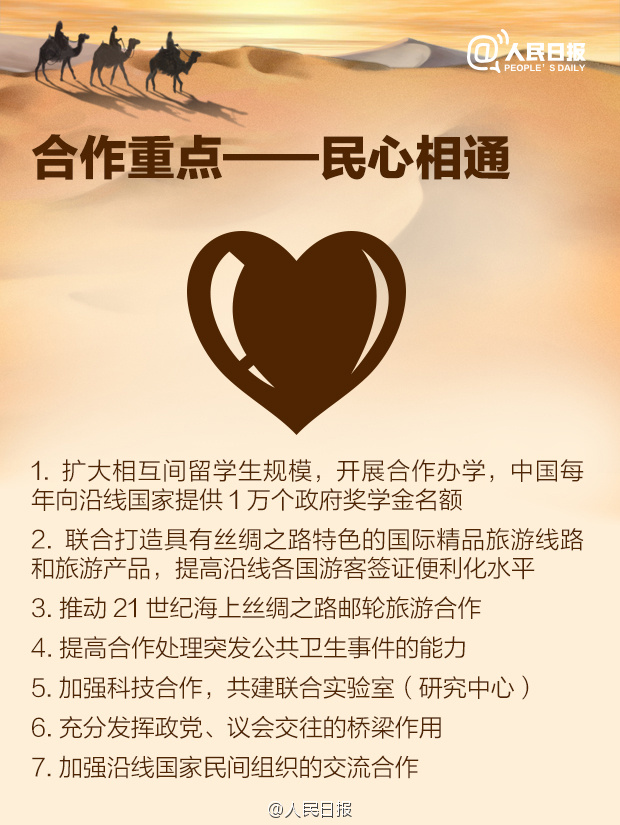 扩大相互间留学生规模,开展合作办学,中国每年向沿线国家提供1万个政府奖学金名额。沿线国家间互办文化年、艺术节、电影节、电视周和图书展等活动,合作开展广播影视剧精品创作及翻译,联合申请世界文化遗产,共同开展世界遗产的联合保护工作。深化沿线国家间人才交流合作。