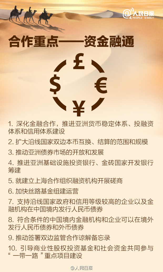 资金融通。资金融通是“一带一路”建设的重要支撑。深化金融合作,推进亚洲货币稳定体系、投融资体系和信用体系建设。扩大沿线国家双边本币互换、结算的范围和规模。推动亚洲债券市场的开放和发展。共同推进亚洲基础设施投资银行、金砖国家开发银行筹建,有关各方就建立上海合作组织融资机构开展磋商。加快丝路基金组建运营。深化中国-东盟银行联合体、上合组织银行联合体务实合作,以银团贷款、银行授信等方式开展多边金融合作。支持沿线国家政府和信用等级较高的企业以及金融机构在中国境内发行人民币债券。符合条件的中国境内金融机构和企业可以在境外发行人民币债券和外币债券,鼓励在沿线国家使用所筹资金。