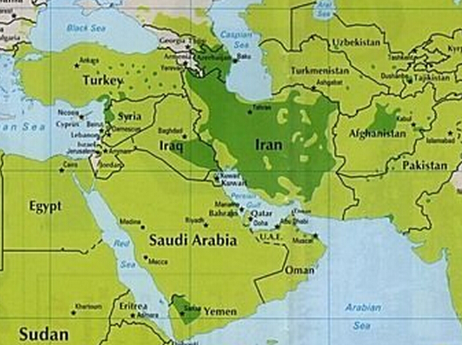 中东地区教派分布,深绿色为什叶派优势区