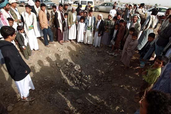 3月28日,在也门首都萨那,人们聚集在一个空袭留下的弹坑旁。正在埃及沙姆沙伊赫出席阿拉伯国家联盟(阿盟)峰会的阿盟秘书长阿拉比3月29日说,多个阿拉伯国家对也门的军事行动将持续下去,直到胡塞武装组织“交出武器并撤出所占区域”。新华社/法新