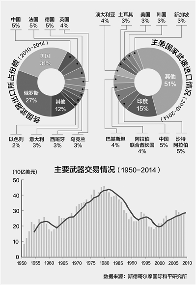 3月16日,瑞典斯德哥尔摩国际和平研究所发布全球军贸情况报告。报告指出,2010年至2014年全球武器贸易量较2005年至2009年增加了16%。其中,在2009年至2014年的武器出口贸易中,美国稳居第一,占全球武器出口量的31%;俄罗斯位列第二,占比为27%;而排名三到五位的国家,所占比例均在5%左右。