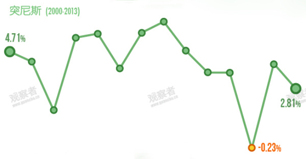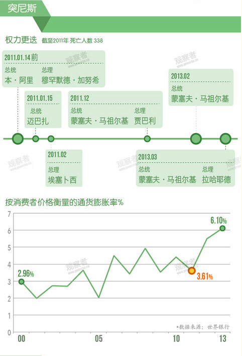 可以看到,2011年突尼斯的GDP增长率同样落在最低谷。短短两年中,权力更迭频繁,通货膨胀率持续上升。