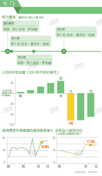 早在去年底,观察者网就整理各国数据,制作图说《阿拉伯之春四周年祭》。也门局势恶化后,CNN也制作图文专题反思:“看看阿拉伯革命曾波及的几个国家,看看革命给它们带了什么来吧。”专题梳理了也门、突尼斯、埃及、利比亚和叙利亚这五个国家革命前后的境况。现特编译CNN专题,配以数据图说,让读者更为直观地了解这些国家如何由“春”入“冬”,并向各国死难者致以最沉痛的悼念。