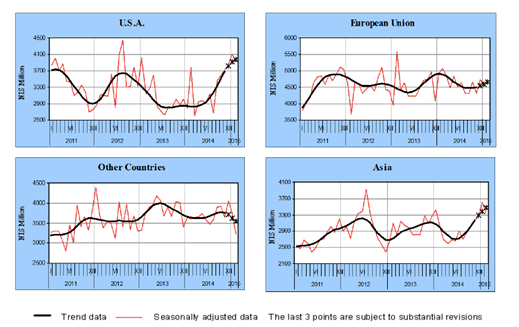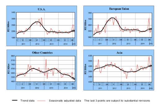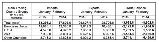 2011到2015财年以色列主要贸易伙伴有美国、欧盟和以中国为主的亚洲国家。据以色列中央统计局报告显示, 2014年12月至2015年2月,进口方面,以欧贸易增长率提升了4.5%,以美增加了12.4%,与亚洲国家贸易增长8.4%。出口方面,以欧贸易增长13.2%,以美贸易增长35.8%,与亚洲国家贸易增长了46.4%。