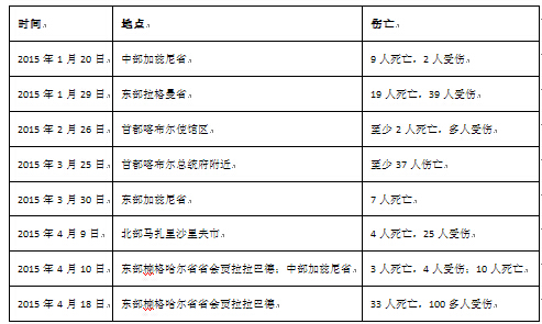 表5. 2015年1月—4月阿富汗恐怖爆炸案统计表