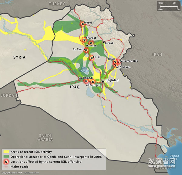 绿色表示2006年基地组织和逊尼派武装在伊拉克的活动范围,黄色表示2014年伊斯兰国的活动范围