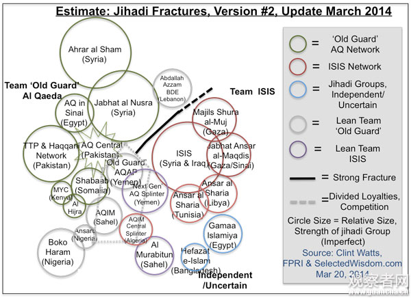 暗斗方面,IS一面凭借“优厚”的待遇与社交媒体宣传,从穆斯林世界乃至西方争取年轻一代“圣战士”,一面向其“旧主”广挖墙脚,使原“基地”直系下属或旁系伙伴印尼“伊斯兰团”、阿尔及利亚“哈里发军”、埃及的耶路撒冷支持者、利比亚“安萨尔旅”及尼日利亚“博科圣地”等纷纷易帜。