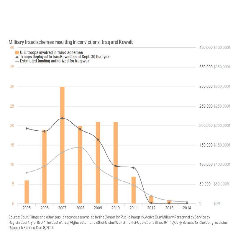 此外,还有一些人通过合同诈骗来实施犯罪。例如,陆军少校艾迪·普莱斯利(Eddie Pressley)和约翰·科克汉姆(John Cockerham)在订购军需时,利用手中签订和审查合同的权力来索取贿赂。科克汉姆最终被判处有期徒刑17年半,这也是在伊拉克和阿富汗服役的士兵中,因为欺诈而被判处的最长有期徒刑。还有至少七位在伊拉克和科威特服役的士兵因为参与共谋而被判刑。共谋问题也吸引了广泛的注意力,一位军官向联邦调查员坦白她至少接受了22.5万美金的贿赂,随后自杀身亡。