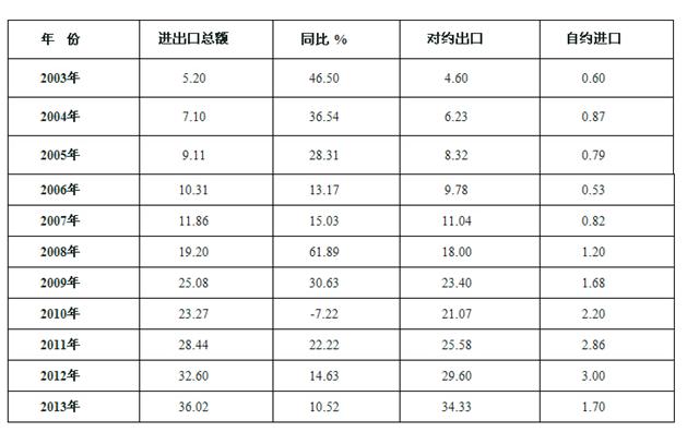 表三:中国与约旦双边贸易额(2003年-2013年,单位:亿美元)数据来源:中华人民共和国商务部