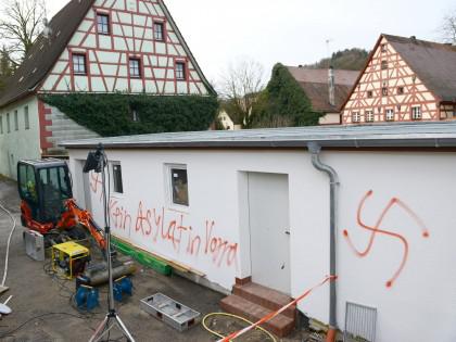 巴伐利亚州纽伦堡市附近的佛拉小镇。墙上写的“佛拉不要难民”和纳粹标志。