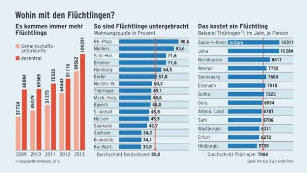 《法兰克福汇报》和Pro-Asyl(“支持难民”网站)共同给出 的统计,从左到右依次为:2009-2013年德国难民安置点中集体和散户各自增长趋势、难民在德国各联邦州的安置点分布、2012年图林根州各城市为每 位难民投入的欧元数。所以,各联邦州接纳难民的人数,与州的大小无关,而是与本州的意愿有关。
