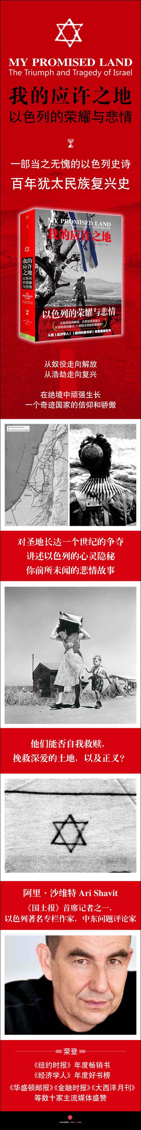 《我的应许之地:以色列的荣耀与悲情》是一部震撼人心的以色列建国史,也是百年来犹太民族的奋斗复兴史。作者阿里•沙维特以自己家族故事为引子,通过亲身经历、深度访谈,历史文献、私人日志、信件等,通过一个个扣人心弦的个体故事,试图描述出以色列的全景大历史,以引出更深层次的以色列国家思考,并对中东地区的纷争渊源进行了历史性梳理。《我的应许之地》从作者的曾祖父写起,这位犹太复国主义者是一位英国绅士,1987年却果断横跨地中海走向圣地,意识到这即将是本民族的未来之路;20世纪20年代一个怀理想主义的年轻农夫,自他的阿拉伯邻居处购入了土地种植雅法蜜桔,用汗水在不毛之地培育出富足繁荣;二战时期德军将至,具有先知使命感的古特曼,率领青年人攀登历史废墟马萨达,激励他们心中强大的犹太复国主义精神;1948年在吕大驱逐的悲剧性的一幕中,全城老小在流泪中背井离乡、渐行渐远;我们看到了二战后纳粹大屠杀的幸存者们,在应许之地辛勤地建设这个荣耀之国,并努力将孩子们培养成真正的新以色列人;60年代纵横捭阖的以色列政治家们,在艰难局势中,顽强推动了绝密的以色列核计划;1973年赎罪日战争的惨痛,令举国反思以色列的未来在哪里;以及今天引领世界潮流的互联网以色列新兴企业,还有在那些特拉维夫蓬勃发展的俱乐部里纵夜狂欢的青年男女……