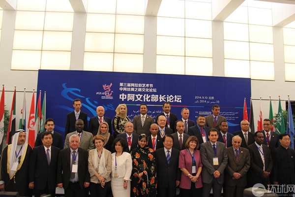 9月10日上午,中国文化部部长蔡武和19个阿拉伯国家的政府文化代表团团长以及阿拉伯联盟代表聚首中国国家博物馆,召开第三届阿拉伯艺术节丝绸之路系列文化论坛之中阿文化部长论坛,会议着重就进一步扩大中阿文化交流与合作,在文化领域共建“一带一路”,增进中阿民心相通等方面达成了共识,通过了《中阿文化部长论坛北京宣言》。