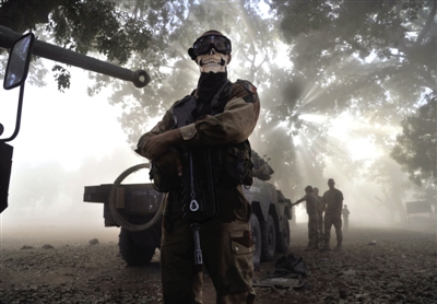 1月20日,支援马里政府军的一名法国士兵头戴面罩在执勤。