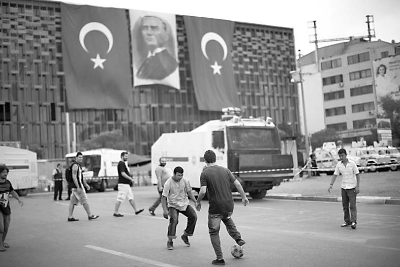 15日,抗议者于示威间隙在塔克西姆广场踢球。