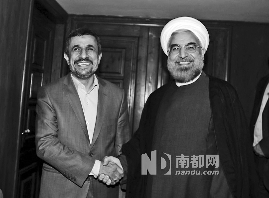 6月18日,伊朗总统网站公布图片,即将离职的总统内贾德与新当选总统鲁哈尼(右)握手。