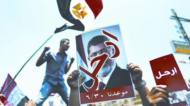 在开罗解放广场抗议者手举穆尔西离开的标语游行。