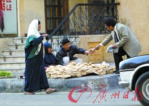 在埃及首都开罗街头一个早点摊上,一位顾客(右一)在买阿拉伯大饼。阿拉伯大饼是埃及百姓的主要主食。埃及政府为保证低收入百姓的基本生存需要,曾长期对大饼所用的原料——面粉的消费实施补贴。