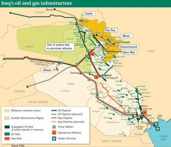 攻城掠地不是关键,重要的是ISIL可能占领伊拉克石油中心基尔库克(Kirkuk)许多石油与天然气输送管道都在这一地区。下图红色为天然气管线,蓝色为石油管线。红色方块地区代表天然气田,蓝色方块地区代表油田。