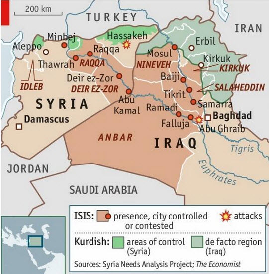 《华盛顿邮报》还以美国读者的视角制作了下图,我们可以看到,ISIL的控制范围相当于美国中部的伊利诺州到东海岸的弗吉尼亚州。