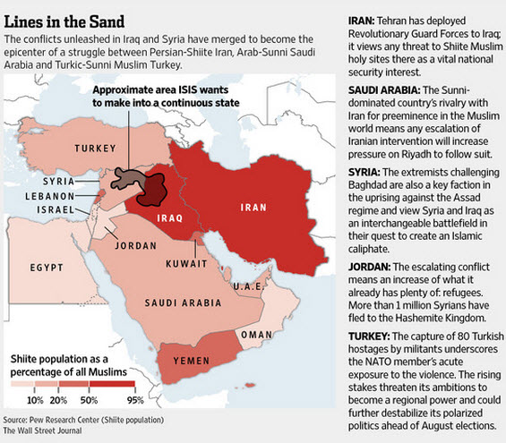 下图黑色区域大致是ISIL企图成立国家的区域。红色深度代表什叶派教徒占穆斯林总人数的比例,颜色越深代表比例越高。