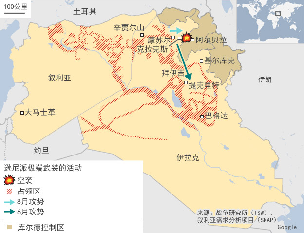 很快,ISIL的胃口就越来越大,该组织向巴格达开进的进程也颇令外界侧目,尽管美国国务卿克里曾为伊拉克当局打气,称“ISIL几乎短期之内攻不下巴格达”。但叛军已经把战线稳固在了巴格达70公里外的地带,当巴格达在6月下旬就已面临三面合围的境地时,奥巴马在8月7日授权的“有针对性的空袭”终于开始:两架“超级大黄蜂”已飞进伊拉克北部领空,对着ISIL的炮兵阵地丢下了两枚500磅航弹。
