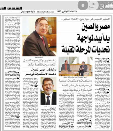 2013115日,埃及《金字塔晚报》以《中埃携手 共同应对未来挑战》为题,刊登该报副主编苏努提对驻埃及大使宋爱国的专访,主要内容如下: