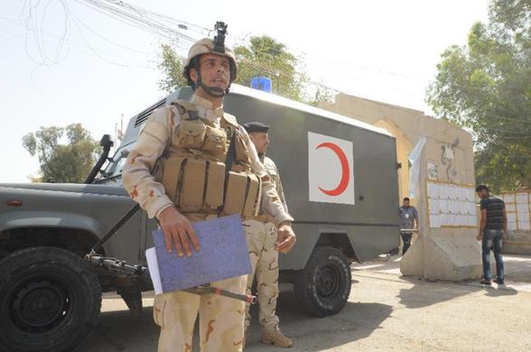 4月20日,在伊拉克首都巴格达的一投票站门口,伊拉克士兵正在警戒,其身后是一辆军用救护车。新华社记者梁有昶 摄