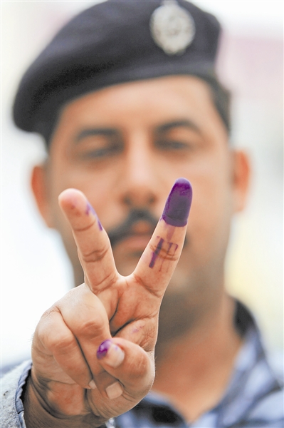 4月13日,在伊拉克首都巴格达,一名警察参加省级议会选举投票后展示指头上的墨迹。伊拉克安全部队人员当地时间13日7时开始前往伊12个省的投票站,进行省级议会选举的提前投票。这是2011年美国撤军后伊拉克举行的首次大规模全国性选举。新华社发