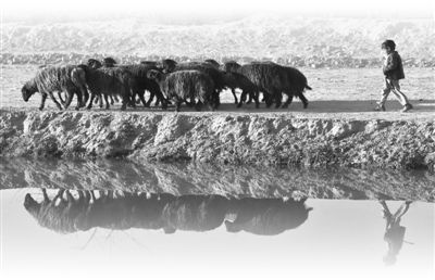 一个阿富汗小羊倌走过水渠。
