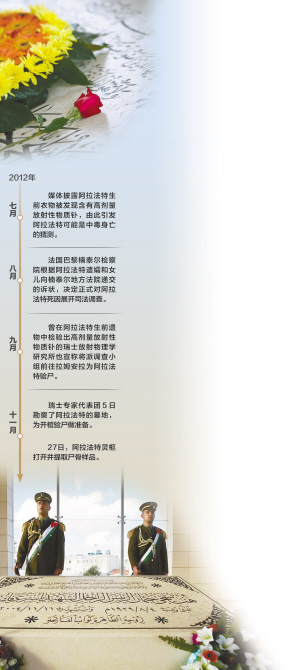 2004年10月,阿拉法特由拉姆安拉前往法国贝尔西军医院接受治疗。同年11月11日,阿拉法特在法国逝世。今年7月,据阿拉伯电视台披露,瑞士洛桑大学放射物理学研究所在阿拉法特生前的衣物里检测出高剂量的放射性物质“钋”,由此引发阿拉法特可能是中毒身亡的猜测。今年8月,法国巴黎楠泰尔检察院根据阿拉法特遗孀苏哈和女儿扎赫娃向楠泰尔地方法院递交的诉状,决定正式对阿拉法特死因展开司法调查,巴方随后同意为阿拉法特开棺验尸以查明其真正死因。