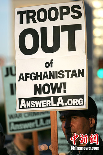 当地时间2012年3月20日,在美国入侵伊拉克九周年之际,一群反战示威人士手持抗议标语牌在洛杉矶联邦大楼外示威,要求美军立即撤出阿富汗及还伊拉克公正。(中新社发 林戈 摄)