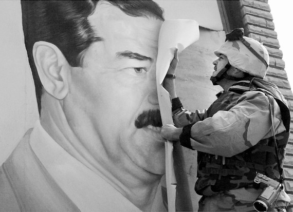 2003年3月21日,一名美军士兵在伊拉克撕下萨达姆的图像。
