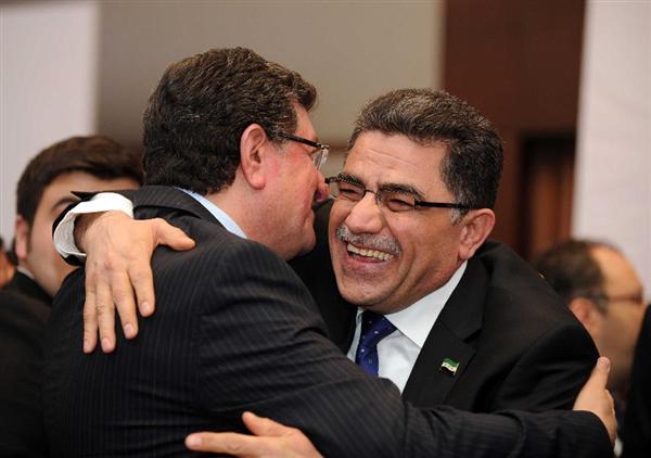3月19日,在土耳其伊斯坦布尔,加桑·希托(右)当选叙利亚反对派“临时政府总理”后和与会代表拥抱庆祝。叙利亚一些反对派代表19日凌晨在土耳其伊斯坦布尔举行会议,选举加桑·希托为叙利亚反对派“临时政府总理”。叙利亚全国联盟新闻官哈立德·萨利赫说,选举出的“临时政府”和“总理”将受叙利亚全国联盟领导,并在叙利亚境内反对派控制区展开工作。而前一日,叙利亚最大反对派叙利亚全国协调机构在大马士革发表声明说,叙利亚全国联盟选举“流亡政府”的行为“切断了国际社会解决叙利亚危机的道路”,并表示叙利亚全国协调机构不接受任何形式的“临时政府”,只接受一个包括反对派以及现政府成员的过渡政府。(新华社记者马研摄)