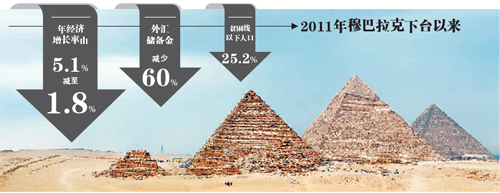 在2011年穆巴拉克下台以来,埃及的海外投资和旅游业的收入骤降,随之而来的是外汇储备下降60%,埃及经济增速从2010年的5.1%锐减至2011年的1.8%,埃及镑也在急速贬值。这一切导致食品价格飙升,失业率上涨,还有燃油和家用燃气的短缺。