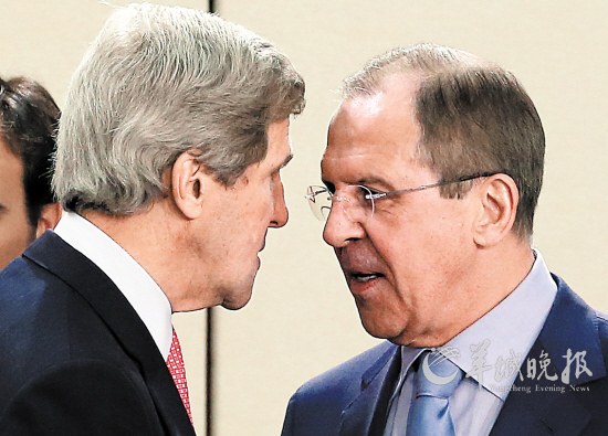5月份的一次会议上,美国国务卿克里和俄罗斯外长拉夫罗夫在交谈