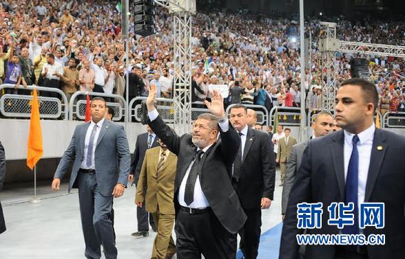 2013年6月15日埃及总统穆尔西(中)在埃及开罗国家体育馆叙利亚问题大会上同民众致意的照片。 新华社发(埃及总统府供图)