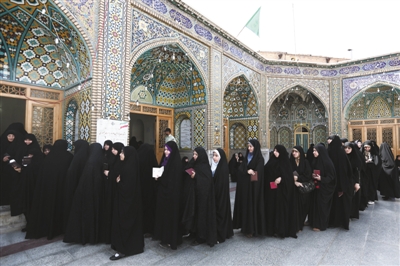 昨日,德黑兰南部城市库姆,伊朗妇女在一座神庙前排队等待投票。