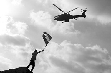 2日,在埃及亚历山大,一架军方直升机从一名挥舞着旗帜的穆尔西的支持者头上飞过。 新华社发