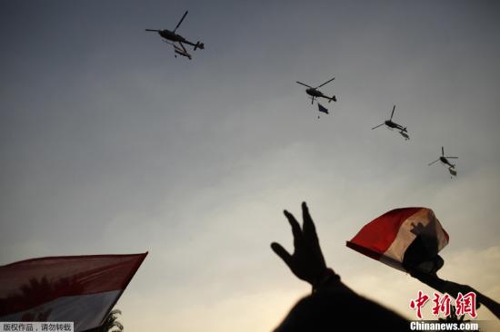 7月4日,埃及最高宪法法院院长阿德勒-曼苏尔宣誓就任该国临时总统。报道称,宣誓现场爆发了长时间的鼓掌声后,曼苏尔开始发表宣誓演说。图为埃及军方在开罗解放广场举行飞行表演,庆祝临时总统宣誓就职。
