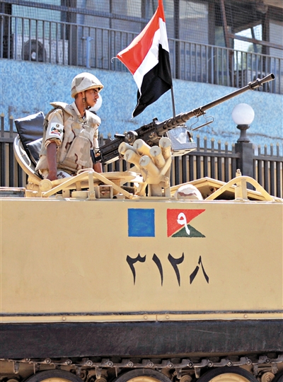 开罗,埃及士兵驻守在国家电视台前,与穆尔西支持者对峙。