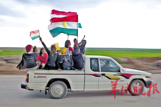 一群库尔德人在参加完游行后开着车子举着旗帜飞奔在叙利亚和伊拉克边境 (资料图 2013年3月2日拍摄)