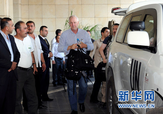 8月18日下午,在叙利亚首都大马士革,联合国调查叙利亚化学武器问题真相小组成员到达大马士革四季酒店。新华社记者 张迺杰摄