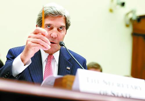 当地时间9月4日,美国华盛顿,美国国务卿克里和国防部长哈格尔在众议院外交事务委员会举行听证会,就军事干预叙利亚问题听证,示威者当庭抗议。当天参议院外交事务委员会已经批准奥巴马政府对叙动武。CFP供图
