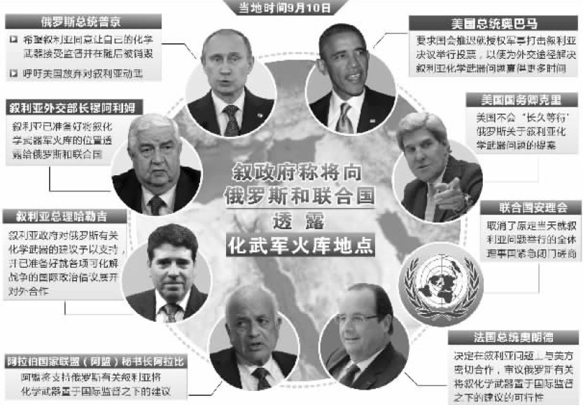 叙利亚总理哈勒吉10日称,基于民众的反战情绪和对叙利亚安全的诉求,叙利亚方面支持俄罗斯的建议。他表示,叙方已经准备好与一切致力于排除杀戮的国际政治方案合作,通过对话走出危机。叙利亚外长穆阿利姆10日透露,叙方已经准备好向俄罗斯和联合国提交叙存放化武的地点,并承诺不再生产化学武器。