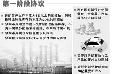美国国务卿克里24日在日内瓦举行的记者会上指出,在接下来6个月时间内,伊朗同意暂停部分浓缩铀活动,美国等将放松对伊朗的制裁。但克里同时指出,对伊朗放松制裁的方式将是“有限和可逆转的”,对伊朗石油禁运和金融制裁等绝大部分措施在6个月内仍将继续。白宫发布消息称,六国减轻制裁将使伊朗增加约70亿美元的收入。